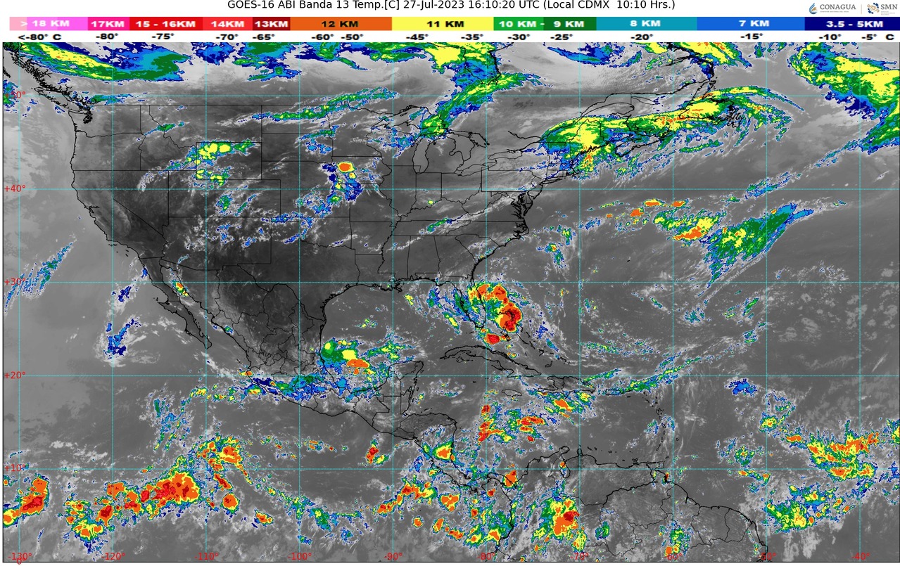 CDMX, 27 de julio del 2023.- Hoy jueves, el monzón mexicano producirá lluvias puntuales muy fuertes, tormentas eléctricas y posibles granizadas en el sur de Sonora, norte de Sinaloa y occidente de Chihuahua, mismas que podrían incrementar los niveles de ríos y arroyos, así como generar deslaves e inundaciones.