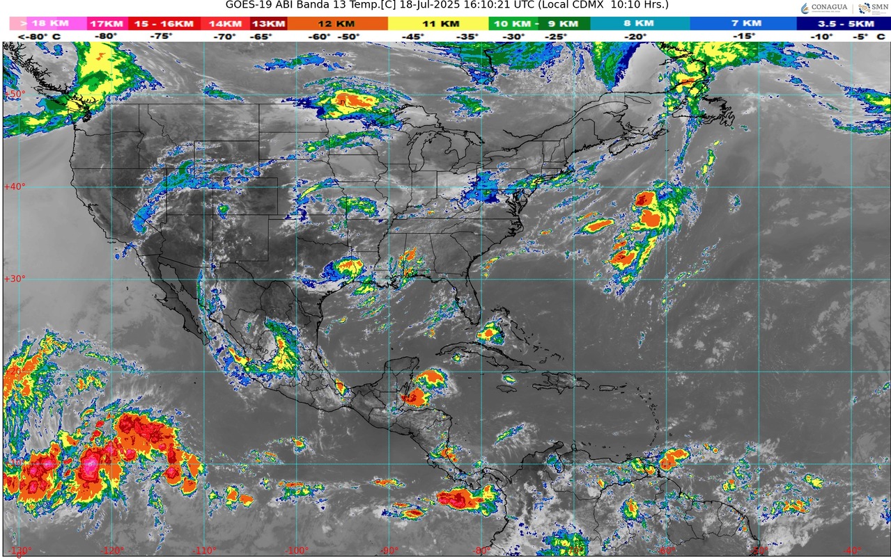 CDMX, 18 de julio del 2025.- Para hoy viernes, una circulación ciclónica en niveles medios de la atmósfera sobre el noroeste de Baja California, en interacción con el monzón mexicano en el noroeste del territorio nacional y con el ingreso de aire húmedo del océano Pacífico, originarán lluvias puntuales intensas en Nayarit y Sinaloa; puntuales muy fuertes en Durango y Chihuahua; y puntuales fuertes en Sonora; así como lluvias con intervalos de chubascos en Baja California, y lluvias aisladas en Baja California Sur.