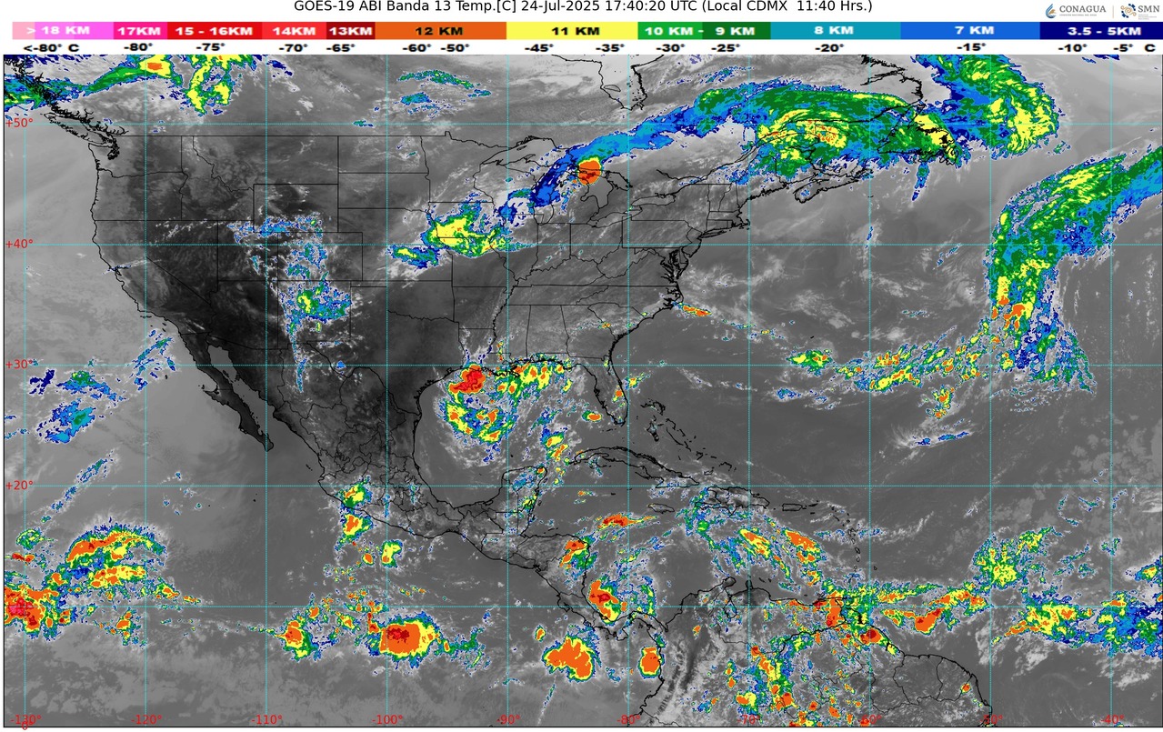 CDMX, 24 de julio del 2025.- Para hoy jueves, el monzón mexicano persistirá sobre el noroeste del territorio nacional y en interacción con una vaguada en altura producirán lluvias puntuales fuertes en Nayarit, Durango y Chihuahua; lluvias con intervalos de chubascos en Sinaloa; y lluvias aisladas en zonas de Sonora.
