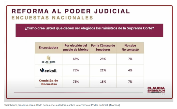 Según estos ejercicios de sondeo, el 75 por ciento de las personas encuestadas por Enkoll y Morena respondieron que los ministros deben ser elegidos por voto popular; De las Heras apuntó que el 68 por ciento de los encuestados consideró positiva esa opción.