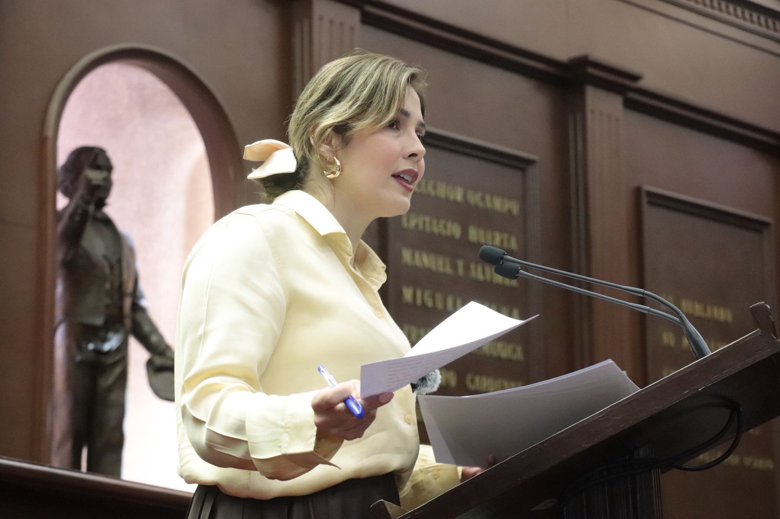 Morelia, Michoacán, a 12 de febrero de 2026.- (45/26). A iniciativa y propuesta de la diputada local Brissa Arroyo Martínez, se inscribirá con letras doradas el nombre de “Amalia Solórzano Bravo”, en el muro de honor del Palacio Legislativo.