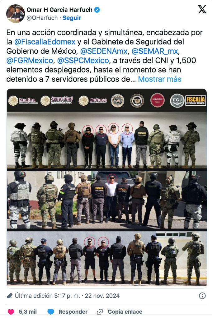 A través de su cuenta en la red social X, Omar García Harfuch, titular de la SSPC federal, confirmó el operativo y señaló la detención de al menos siete funcionarios con presuntos nexos con el crimen organizado, así como la colaboración entre la Fiscalía mexiquense y las dependencias federales.