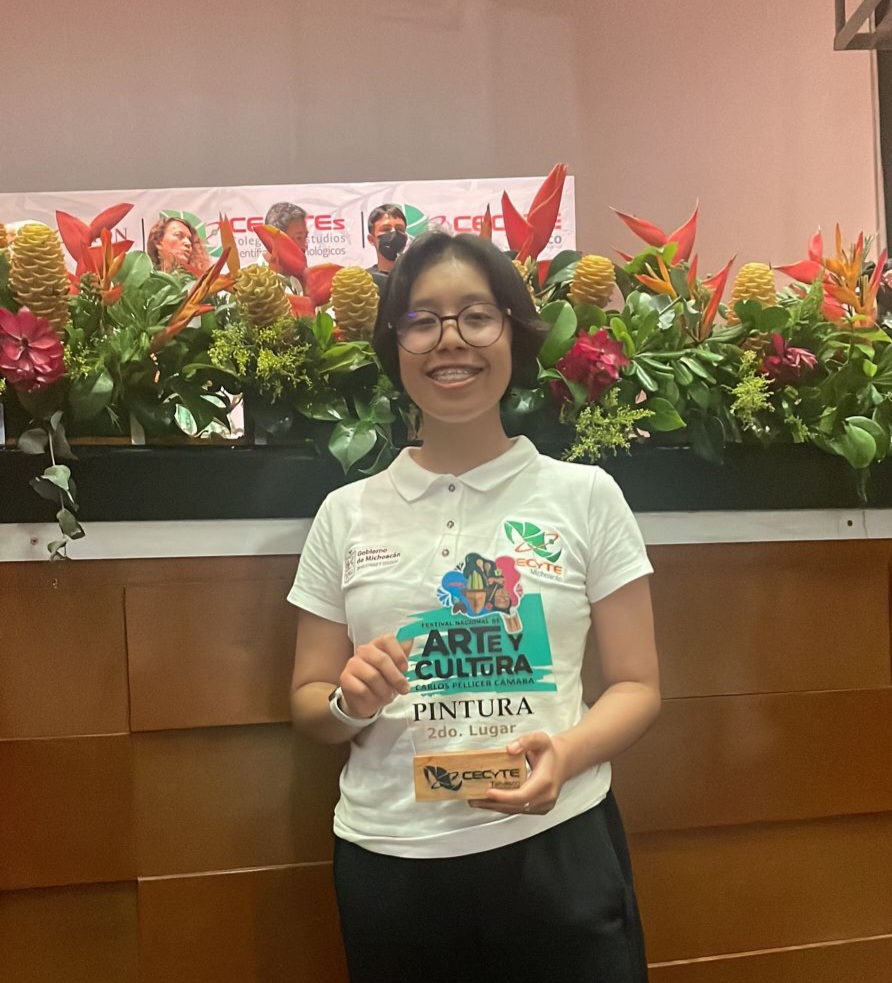 Villahermosa, Tabasco, 1 octubre del 2022.- Nahomi Aldana González, alumna del plantel Irapeo del Colegio de Estudios Científicos y Tecnológicos del Estado de Michoacán (Cecytem), ganó una medalla de plata en la categoría de pintura en el Festival Nacional de Arte y Cultura de los Cecytes 2022 “Carlos Pellicer Cámara”.