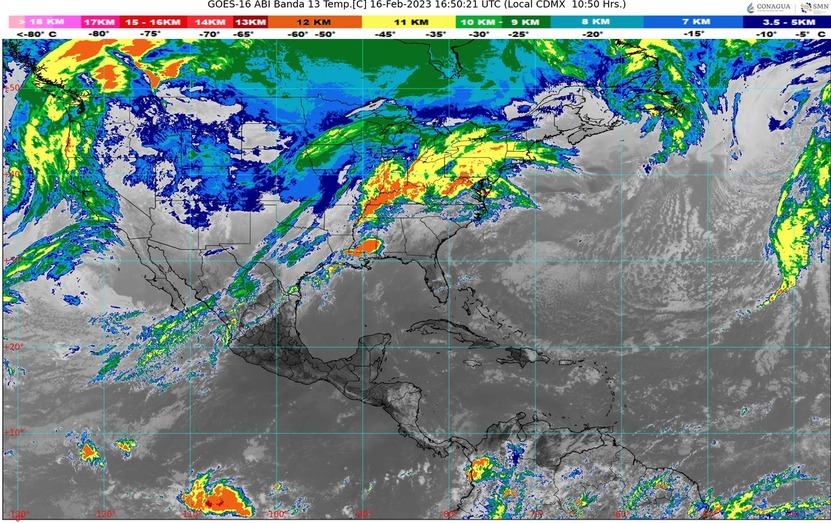CDMX, 16 de febrero del 2023.- Este día jueves, el frente frío Núm. 33 recorrerá el noreste y el oriente de México, originando lluvias puntuales fuertes y descargas eléctricas en Puebla, Veracruz y Oaxaca, además de chubascos en Hidalgo, Tabasco y Chiapas.