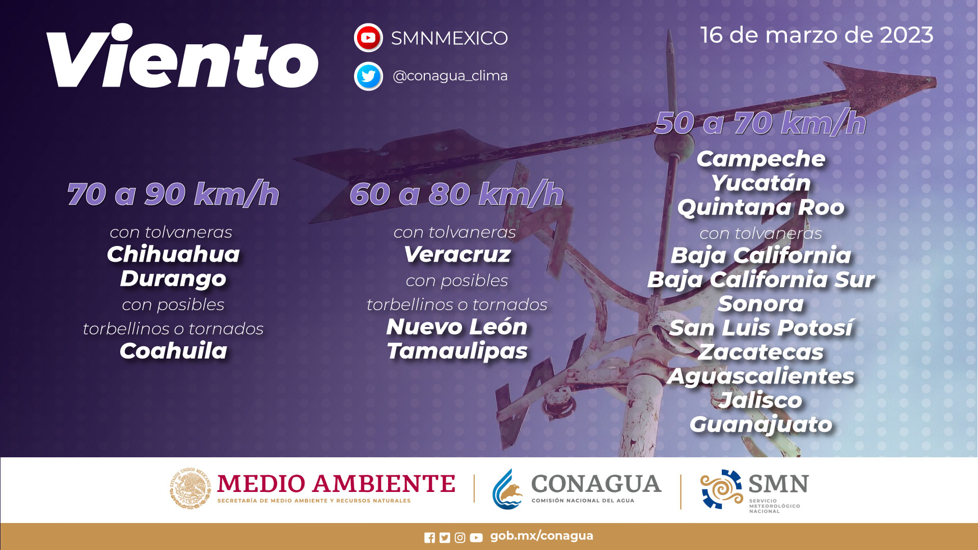 Viento con rachas de 50 a 70 km/h: Campeche, Yucatán y Quintana Roo, y con posibles tolvaneras: Baja California, Baja California Sur, Sonora, San Luis Potosí, Zacatecas, Aguascalientes, Jalisco y Guanajuato.