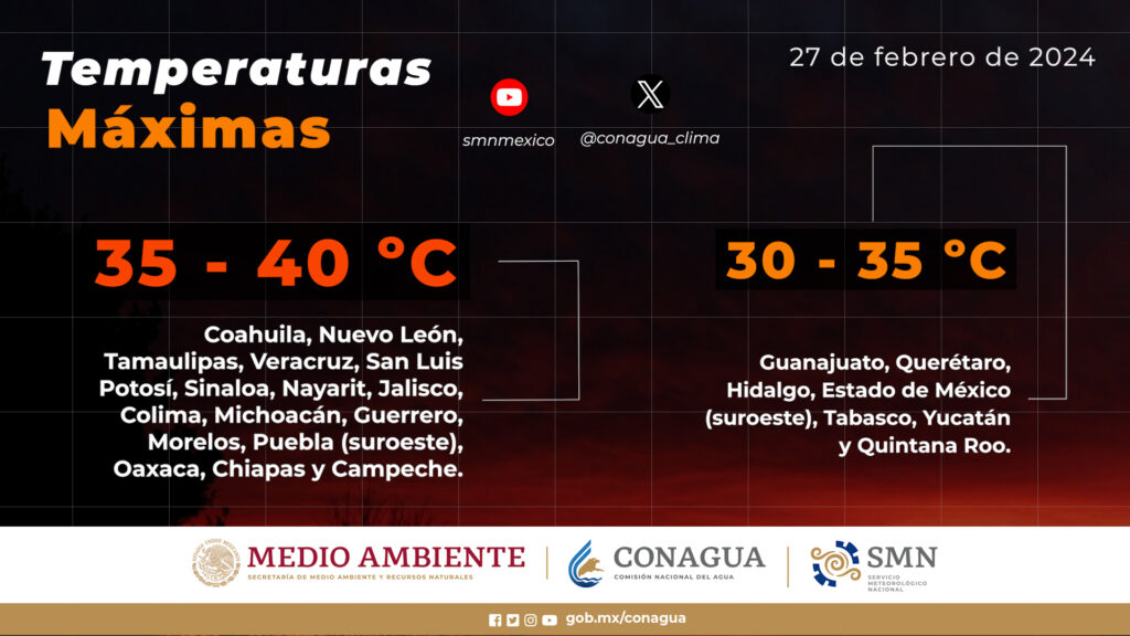 Temperaturas máximas de 35 a 40 °C: Coahuila, Nuevo León, Tamaulipas, Veracruz, San Luis Potosí, Sinaloa, Nayarit, Jalisco, Colima, Michoacán, Guerrero, Morelos, Puebla (suroeste), Oaxaca, Chiapas y Campeche.