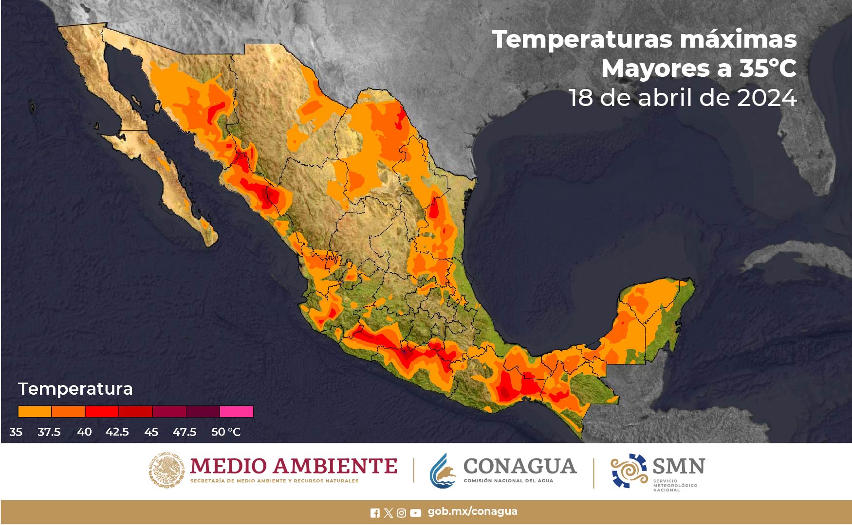 CDMX, 18 de abril del 2024.- Durante este jueves, prevalecerá la onda de calor debido a una circulación anticiclónica en niveles medios de la atmósfera, originando ambiente caluroso a muy caluroso sobre el territorio nacional, con temperaturas máximas que podrían superar los 45 °C en Michoacán, Guerrero, Oaxaca, Chiapas, Veracruz, Tabasco y Campeche.