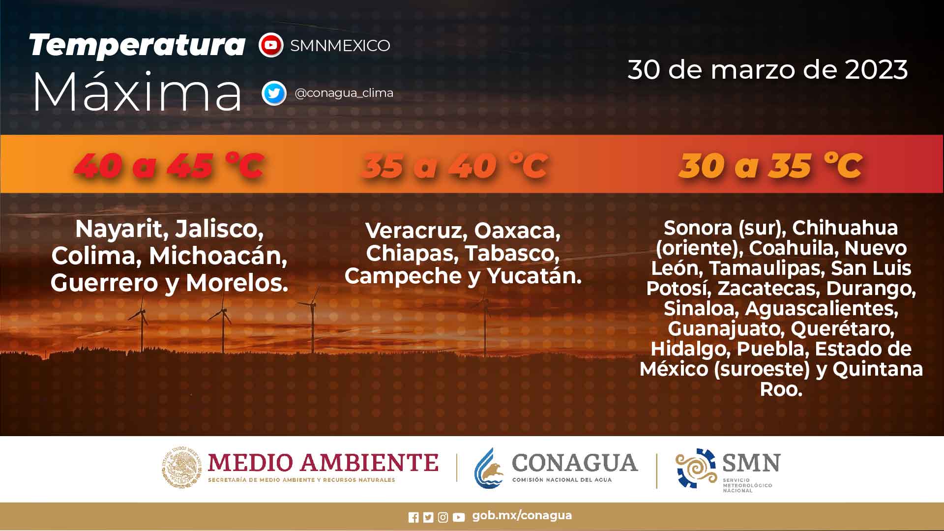 Temperaturas máximas de 40 a 45 °C: Nayarit, Jalisco, Colima, Michoacán, Guerrero y Morelos.Temperaturas máximas de 35 a 40 °C: Veracruz, Oaxaca, Chiapas, Tabasco, Campeche y Yucatán.Temperaturas máximas de 30 a 35 °C: Sonora (sur), Chihuahua (oriente), Coahuila, Nuevo León, Tamaulipas, San Luis Potosí, Zacatecas, Durango, Sinaloa, Aguascalientes, Guanajuato, Querétaro, Hidalgo, Puebla, Estado de México (suroeste) y Quintana Roo.