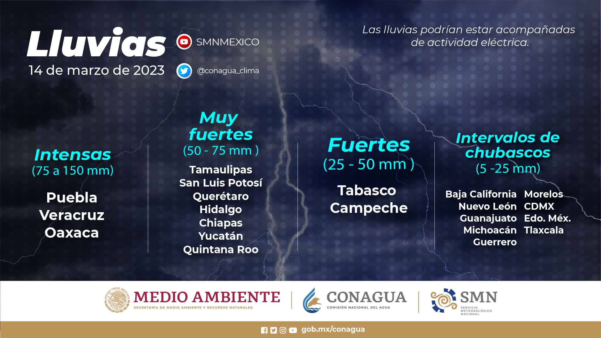 Intervalos de chubascos (5 a 25 mm): Baja California, Nuevo León, Guanajuato, Michoacán, Guerrero, Morelos, Ciudad de México, Estado de México y Tlaxcala.
