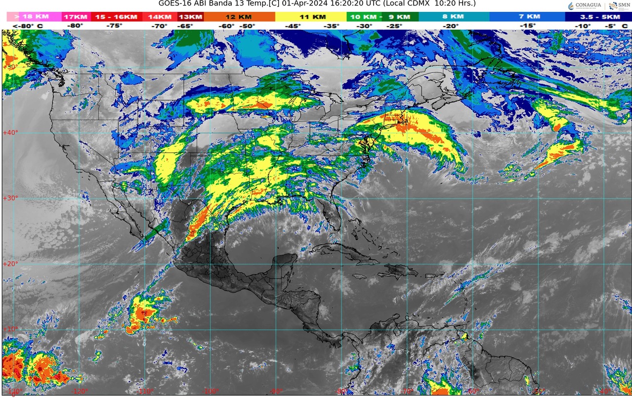 CDMX, 01 de abril del 2024.- Este día lunes, el frente frío No. 43 y la Novena tormenta invernal se desplazarán lentamente sobre el noroeste y norte de México, generando ambiente frío a muy frío, chubascos y lluvias fuertes sobre dichas regiones; además de posible caída de nieve o aguanieve en las sierras de Baja California, Sonora, Chihuahua, Durango (norte) y Sinaloa (sierra norte). Asimismo, se prevén vientos con rachas de 100 a 120 km/h en Chihuahua y Durango; de 80 a 100 km/h en Zacatecas y de 70 a 80 km/h en Sonora y Aguascalientes; todos con tolvaneras; también se registrará oleaje de 2 a 3 metros de altura en la costa occidental de la Península de Baja California.