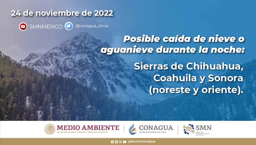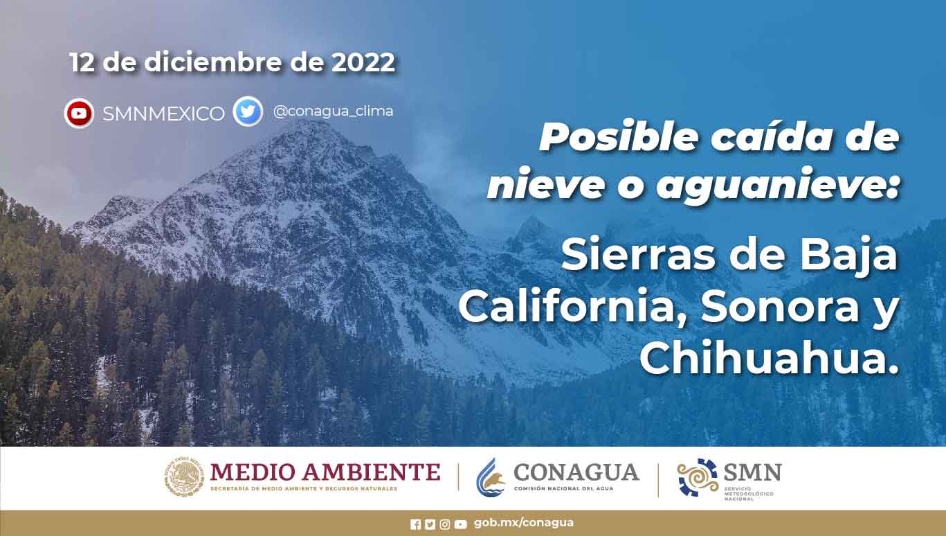Posible caída de nieve o aguanieve: sierras de Baja California, Sonora y Chihuahua.