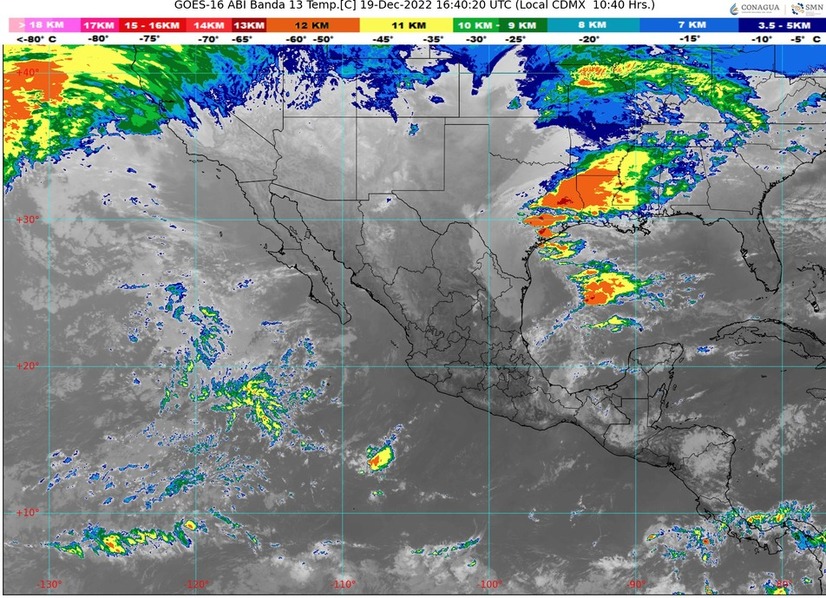 CDMX, 19 de diciembre del 2022.- Para hoy lunes, el frente Núm. 17 se extenderá sobre el oriente del Golfo de México, en interacción con un canal de baja presión localizado sobre el occidente de dicho golfo, ocasionarán lluvias e intervalos de chubascos en el noreste, oriente y sureste de México, así como en la Península de Yucatán, con lluvias puntuales fuertes en Veracruz, Tabasco y Chiapas.