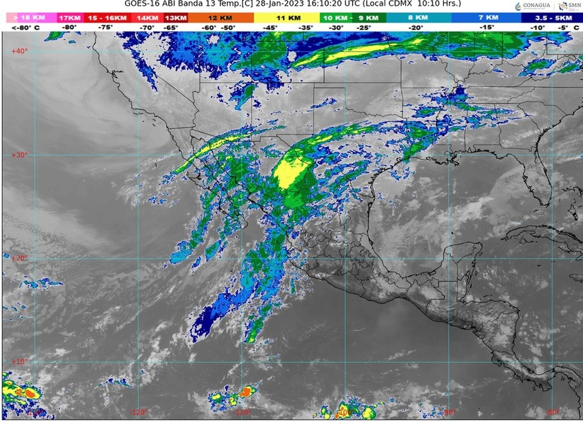 CDMX, 28 de enero del 2023.- Un canal de baja presión en el sur del Golfo de México y la entrada de humedad del Mar Caribe, producirán lluvias y chubascos en el sureste del territorio nacional y en la Península de Yucatán. Además, se mantendrá el viento de componente norte con rachas de 50 a 70 km/h en el Istmo y Golfo de Tehuantepec durante la mañana y tarde, disminuyendo gradualmente durante la noche.