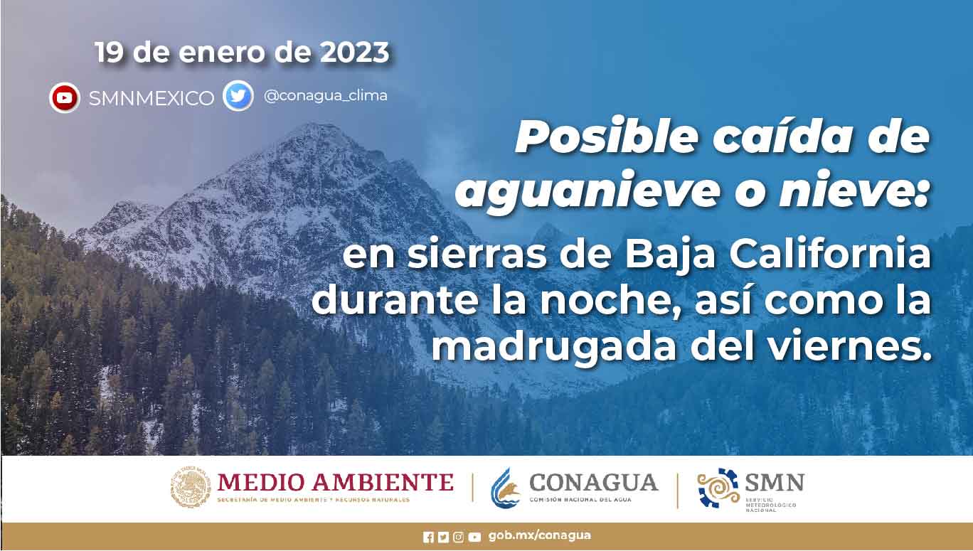 Por la noche, la aproximación de un nuevo frente frío en el noroeste del país, asociado con una vaguada polar y con la corriente en chorro polar, ocasionará lluvias aisladas en Baja California, vientos fuertes con tolvaneras y la posible caída de nieve y/o aguanieve en sierras de dicha entidad durante la noche, así como la madrugada del viernes.