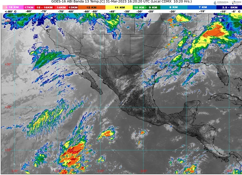 Pacífico Centro: Cielo medio nublado a nublado y sin lluvia en la región. Ambiente fresco por la mañana, y frío en zonas altas. Por la tarde, ambiente caluroso a muy caluroso. Viento de componente oeste de 10 a 25 km/h en la región, con rachas de 40 a 60 km/h y posibles tolvaneras en Jalisco.