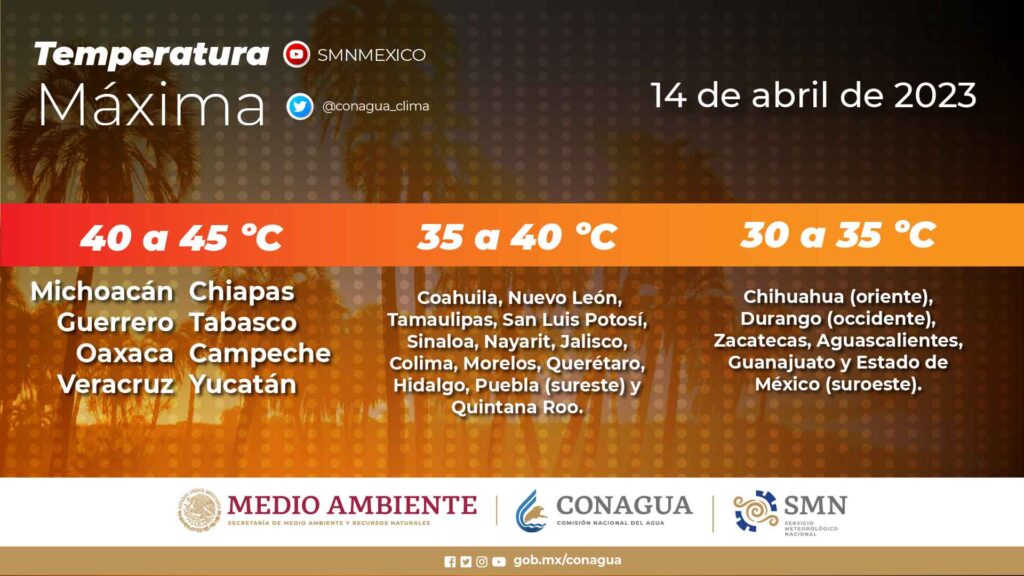 Temperaturas máximas de 35 a 40 °C: Coahuila, Nuevo León, Tamaulipas, San Luis Potosí, Sinaloa, Nayarit, Jalisco, Colima, Morelos, Querétaro, Hidalgo, Puebla (sureste) y Quintana Roo.