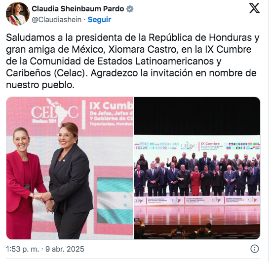 “Saludamos a la presidenta de la República de Honduras y gran amiga de México, Xiomara Castro, en la IX Cumbre de la Comunidad de Estados Latinoamericanos y Caribeños (Celac). Agradezco la invitación en nombre de nuestro pueblo”, publicó Sheinbaum en su cuenta de X.