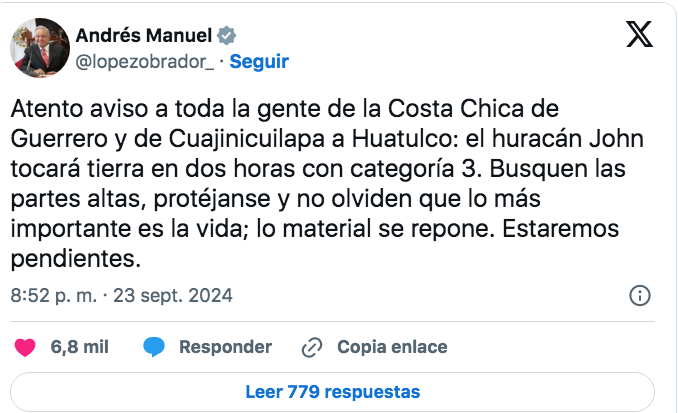 CDMX, 23 de septiembre del 2024.- El presidente Andrés Manuel López Obrador pidió esta noche a la población de la Costa Chica de Guerrero y de Cuajinicuilapa a Huatulco extremar precauciones ante el impacto del huracán John aún de categoría 2.
