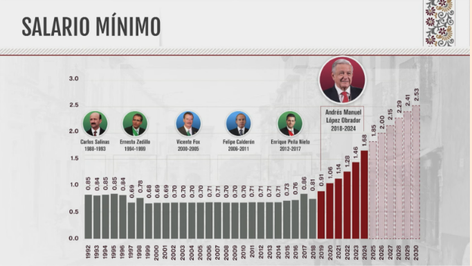Se explicó que, con este aumento, el gobierno busca continuar con la recuperación del poder adquisitivo, alcanzando una acumulada del 135% en términos reales desde 2018. Además, se proyecta que para 2030 el salario mínimo permita cubrir 2.5 canastas básicas, y abarcará necesidades esenciales y renta de vivienda.