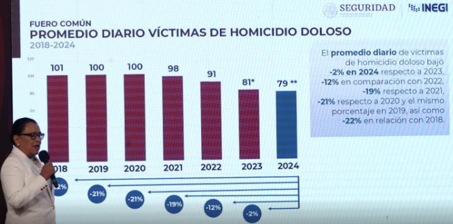 Indicó que el promedio diario de víctimas de homicidio doloso en lo que va de este año es de 79, dos por ciento menor a los 81 diarios reportados durante 2023; 12 por ciento menos en comparación con los 91 de 2022; 19 por ciento a la baja de los 98 en promedio al día registrados en 2021.