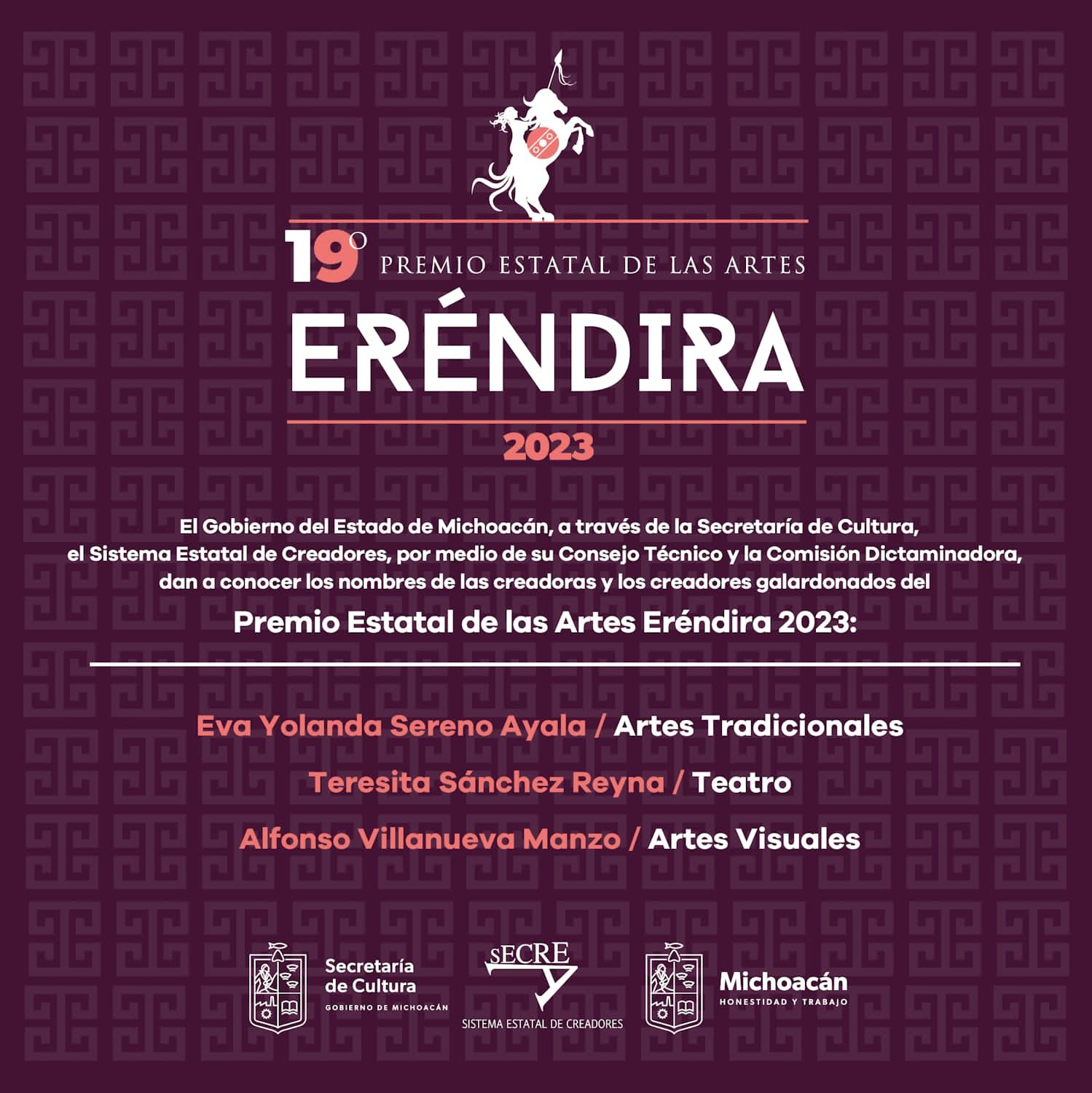 El Premio Estatal de las Artes Eréndira es una distinción impulsada por el Gobierno del Estado desde 2005, protegido mediante Decreto oficial del Ejecutivo estatal y con reglas de operación avaladas por el Congreso local desde 2021. La designación de las personas ganadoras es responsabilidad de una comisión dictaminadora cuya integración se hace mediante procesos de insaculación notarial, asegurando transparencia y legalidad.