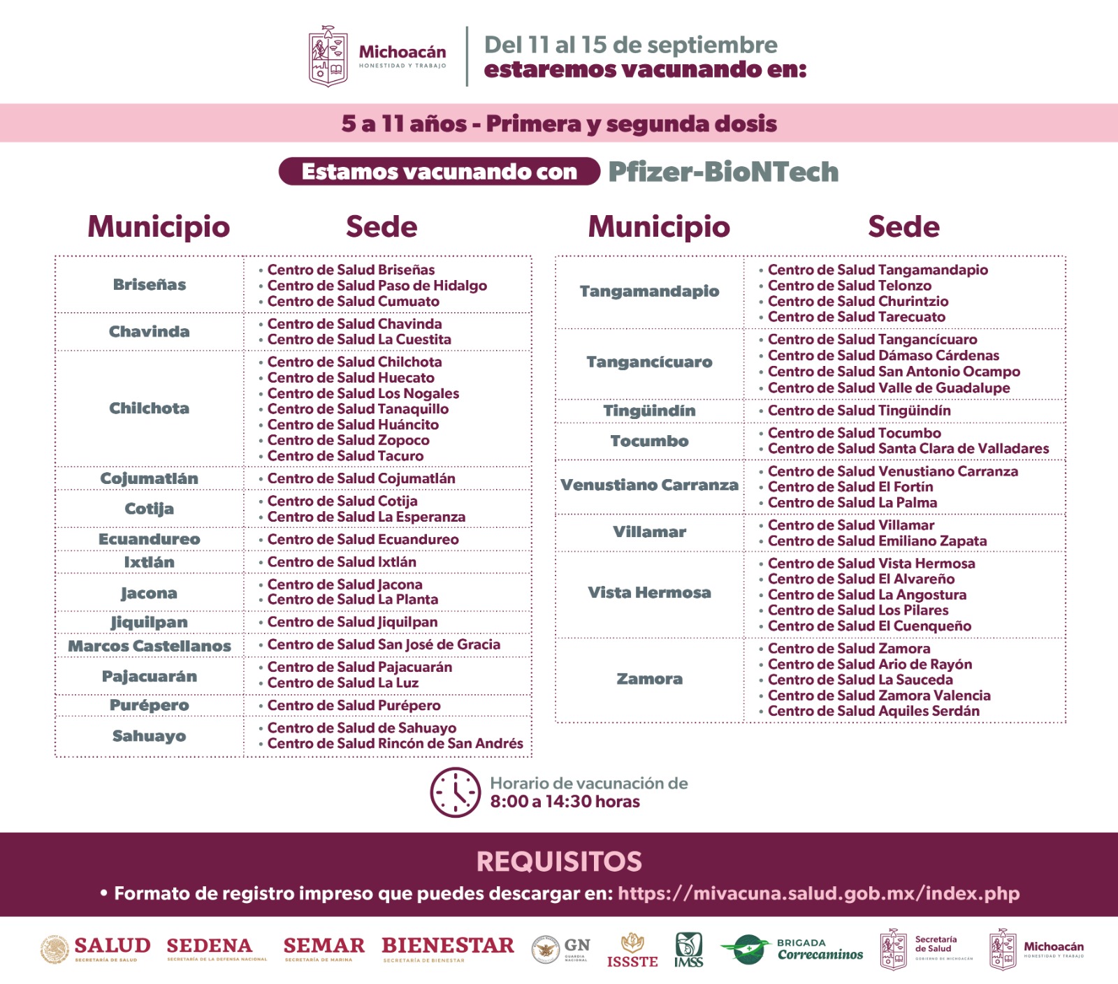 Los puestos de vacunación, hora y municipio podrán ser verificados en la página de Facebook de la Secretaría de Salud de Michoacán, con el propósito de avanzar en las coberturas de inmunización en este grupo de la población.