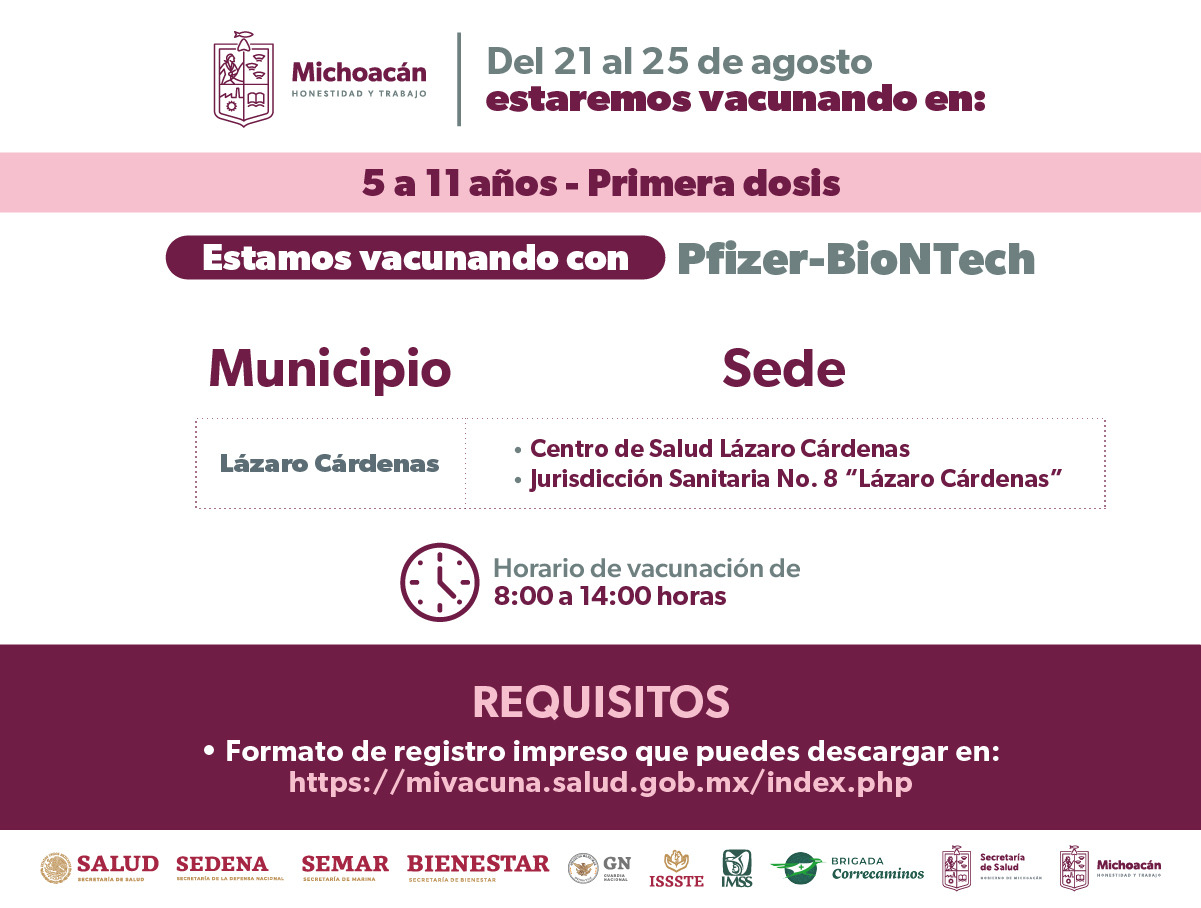 Es así, que del 20 al 25 de agosto se habilitarán 9 sedes de inmunización en el Centro de Salud y la Jurisdicción Sanitaria 8 de Lázaro Cárdenas, Centro de Salud de Uruapan “Dr. José Álvarez Mezquita” y Centro de Salud de Apatzingán.