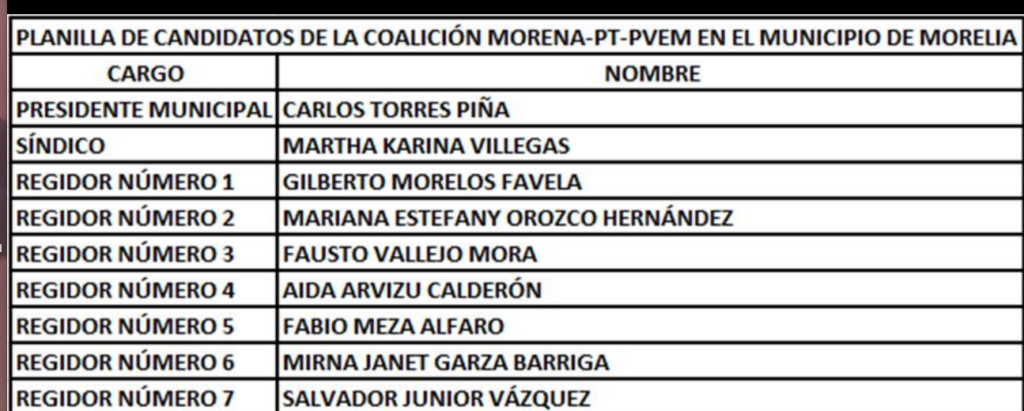 Existe la posibilidad que se dé la participación de 6 candidatos a presidente municipal de Morelia con sus respectivas planillas, el actual alcalde ALFONSO MARTÍNEZ ALCÁZAR postulado en candidatura común por los partidos Acción Nacional y De la Revolución Democrática, logrando integrar una planilla sin muchos problemas o por lo menos no se conoce que los haya habido, planilla que quedó integrada de la siguiente manera: