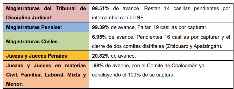 Al inicio de la sesión, la consejera Carol Berenice Arellano Rangel informó que el proceso de captura presenta avances significativos, destacando que el Comité de Coalcomán ya concluyó al 100% la captura de todas sus boletas.