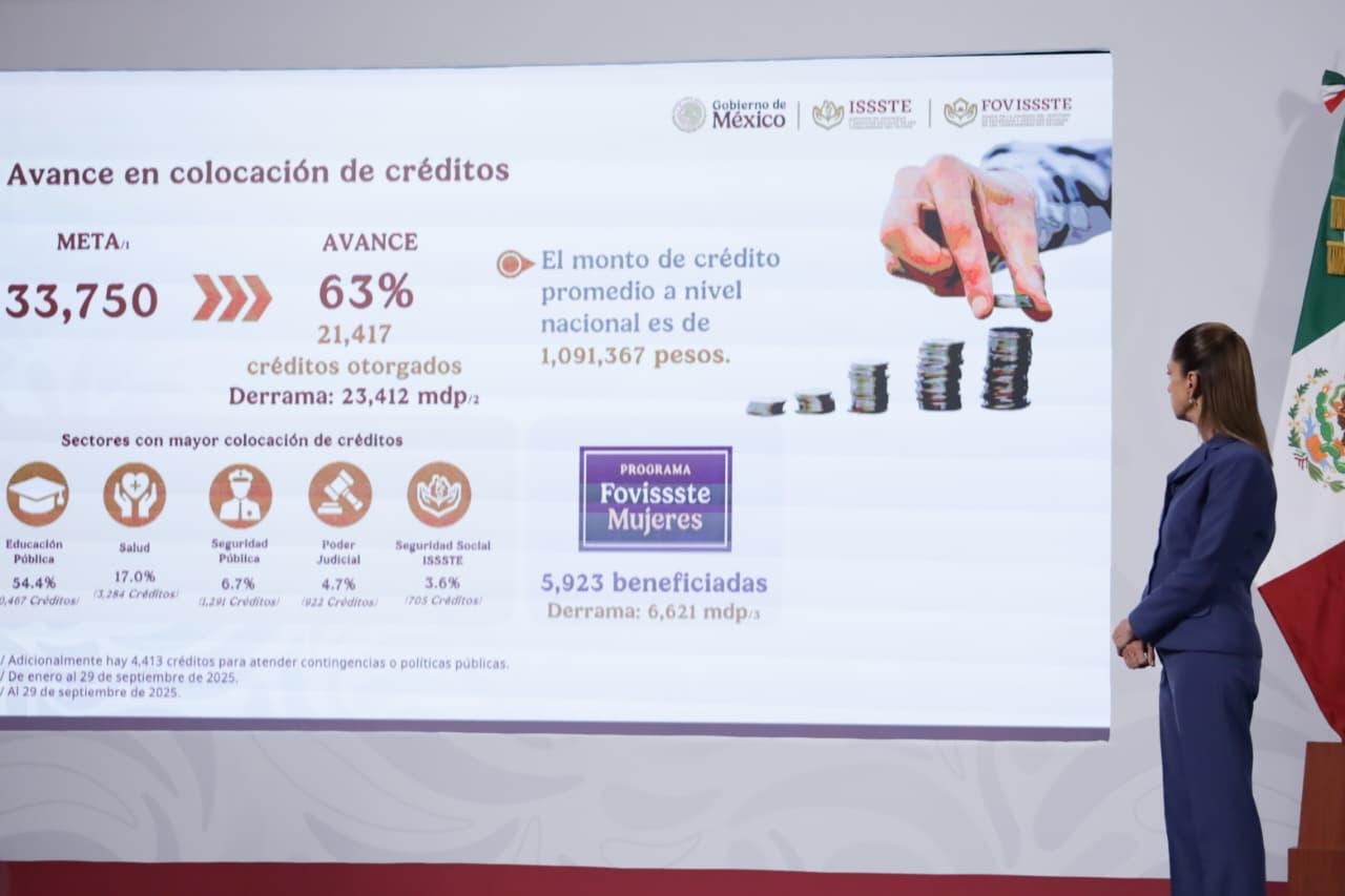 En materia de colocación de créditos del FOVISSSTE, Maldonado Meza reportó un avance del 63 por ciento de su meta anual, al otorgar 21 mil 417 financiamientos que representan una derrama económica superior a 23 mil 400 millones de pesos, con un monto promedio de crédito de un millón 91 mil pesos. Entre los sectores con mayor colocación se encuentran educación pública (54.4 por ciento), salud (17 por ciento) y seguridad pública (6.7 por ciento).