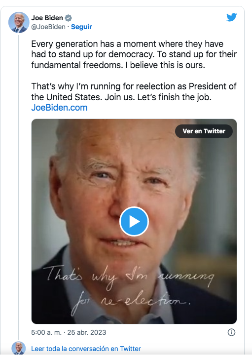 25 de abril del 2023.- El presidente de Estados Unidos, Joe Biden, ha anunciado este martes que se presentará a la reelección en los comicios que se celebrarán en noviembre de 2024.
