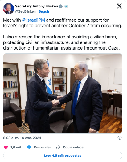 09 de enero del 2024.- El secretario de Estado estadounidense, Antony Blinken, ha reiterado este martes durante su visita a Israel la “necesidad” de llegar a una “paz duradera” para los israelís, los palestinos y el resto de la región y ha subrayado la “importancia de evitar más daños” a los civiles de Gaza. Como parte de una gira regional por Oriente Próximo, Blinken se ha entrevistado con otras autoridades israelís, como el primer ministro, Benjamín Netanyahu, o el ministro de Defensa, Yoav Gallant, que le ha instado a “incrementar la presión sobre Irán”, como vía para evitar una escalada en otros frentes.