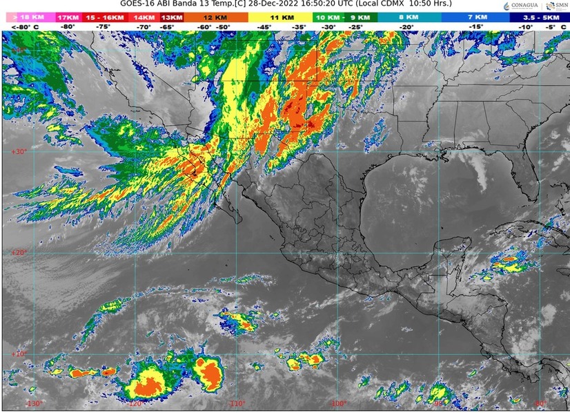 CDMX, 28 de diciembre del 2022.- Este día miércoles, el frente frío Núm. 20 se extenderá sobre el noroeste de la República Mexicana, asociado con una vaguada polar, producirá chubascos y lluvias puntuales fuertes en dicha región, así como rachas fuertes de viento y tolvaneras en el noroeste y norte del territorio nacional. Asimismo, se presentarán condiciones para la caída de aguanieve o nieve en las sierras de Sonora y Chihuahua, a partir de la noche de hoy y la madrugada del jueves.