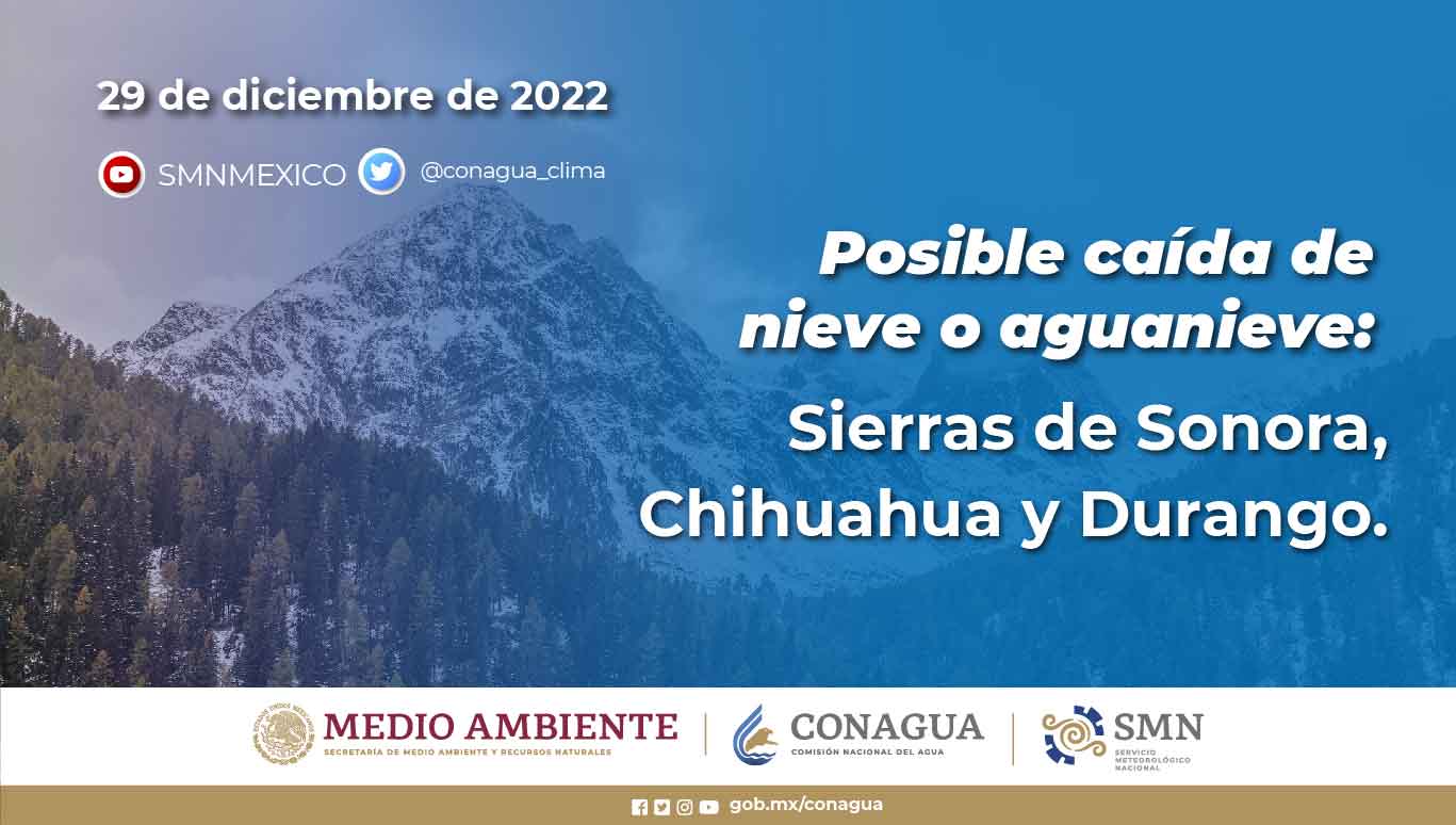 A su vez, continuará la probabilidad para la caída de aguanieve y/o nieve en las sierras de Sonora, Chihuahua y Durango. Por otro lado, el ingreso de humedad del Océano Pacífico, Golfo de México y Mar Caribe, originará lluvias puntuales fuertes en Quintana Roo; chubascos en Campeche y Yucatán; y lluvias aisladas en Michoacán, Puebla, Guerrero, Oaxaca y Chiapas.