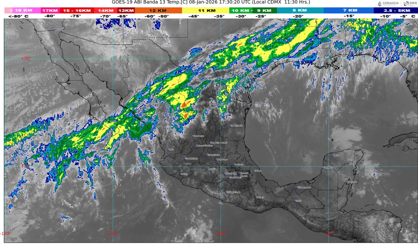 CDMX, 08 de enero del 2026.- Para hoy jueves, el frente frío núm. 27 recorrerá el norte y gradualmente el noreste del territorio nacional en interacción con un canal de baja presión, una vaguada en niveles medios y altos de la atmósfera y con las corrientes en chorro polar y subtropical, lo que generará lluvias y chubascos en Sonora y Chihuahua. Su masa de aire asociada, ocasionará ambiente frío a muy frío en sierras del noroeste de México, así como ambiente gélido por la mañana en zonas serranas de Chihuahua y Durango, con probable caída de nieve o aguanieve en el norte de Sonora y Chihuahua; y vientos con rachas muy fuertes de 70 a 90 km/h en Baja California, Chihuahua y Durango.
