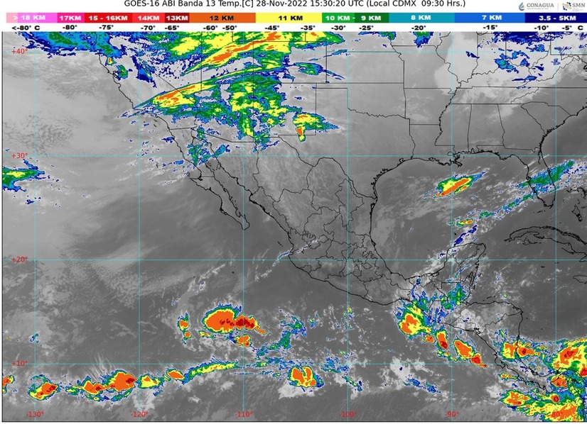 CDMX, 28 de noviembre del 2022.- Para hoy, la entrada de humedad generada por la vaguada monzónica, que se extenderá frente a las costas del Pacífico Sur Mexicano, en interacción con un canal de baja presión sobre el occidente y suroeste del Golfo de México, producirán lluvias puntuales muy fuertes en Oaxaca y Chiapas, así como fuertes en Veracruz, Tabasco, Campeche, Yucatán y Quintana Roo.