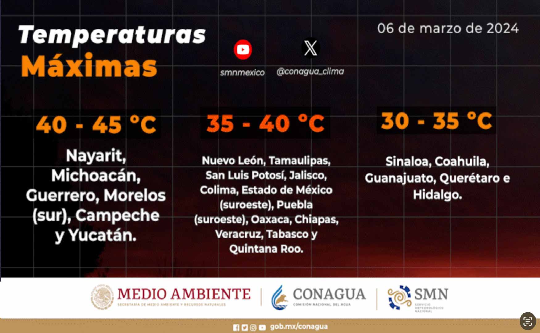 Temperaturas máximas de 40 a 45 °C: Nayarit, Michoacán, Guerrero, Morelos (sur), Campeche y Yucatán.Temperaturas máximas de 35 a 40 °C: Nuevo León, Tamaulipas, San Luis Potosí, Jalisco, Colima, Estado de México (suroeste), Puebla (suroeste), Oaxaca, Chiapas, Veracruz, Tabasco y Quintana Roo.Temperaturas máximas de 30 a 35 °C: Sinaloa, Coahuila, Guanajuato, Querétaro e Hidalgo.