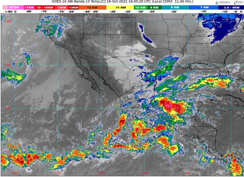 CDMX, 18 de octubre del 2022.- Este día martes, el frente frío Núm. 4 recorrerá el noreste y oriente del territorio nacional, podrá alcanzar el sur de Veracruz esta noche, interaccionará con la onda tropical Núm. 27 que se desplazará sobre el centro y sur México, originando lluvias puntuales torrenciales con descargas eléctricas y posible caída de granizo en Puebla, Veracruz y Oaxaca, lluvias intensas en Hidalgo, Tabasco y Chiapas, muy fuertes en Tamaulipas, San Luis Potosí, Querétaro y Tlaxcala, además de lluvias fuertes en Nuevo León, Estado de México, Ciudad de México y Morelos.