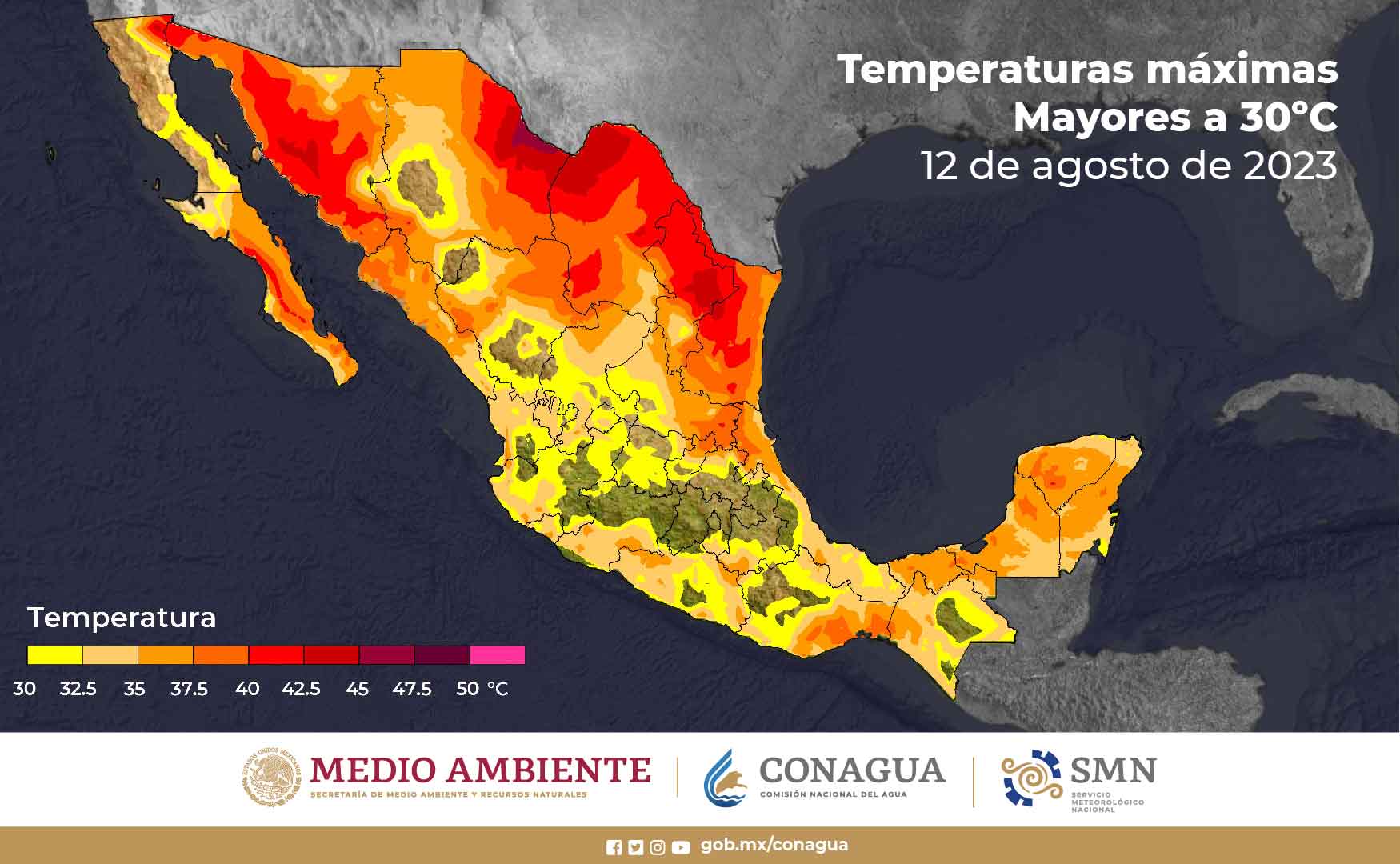 Temperaturas máximas de 30 a 35 °C: Baja California Sur, Sinaloa, Durango, Zacatecas, Aguascalientes, Nayarit, Jalisco, Colima, Michoacán, Guanajuato, Querétaro, Hidalgo (norte), Puebla (norte), Morelos, Guerrero, Oaxaca, Chiapas, Tabasco y Quintana Roo.