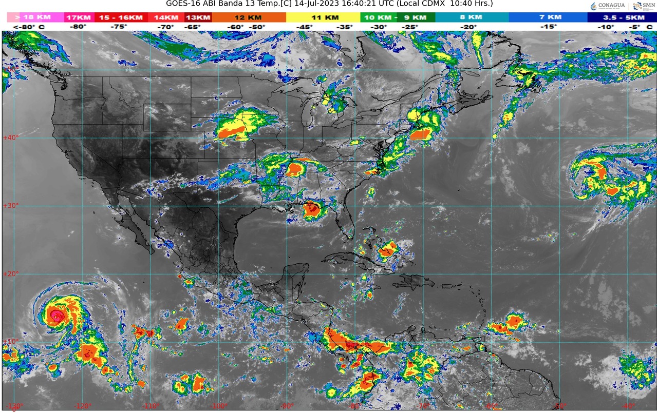 CDMX, 14 de julio del 2023.- Este día viernes, el monzón mexicano continuará sobre el noroeste del país, produciendo lluvias fuertes a puntuales muy fuertes, descargas eléctricas, fuertes rachas de viento y posibles granizadas sobre los estados de Sonora, Sinaloa, Chihuahua y Durango.
