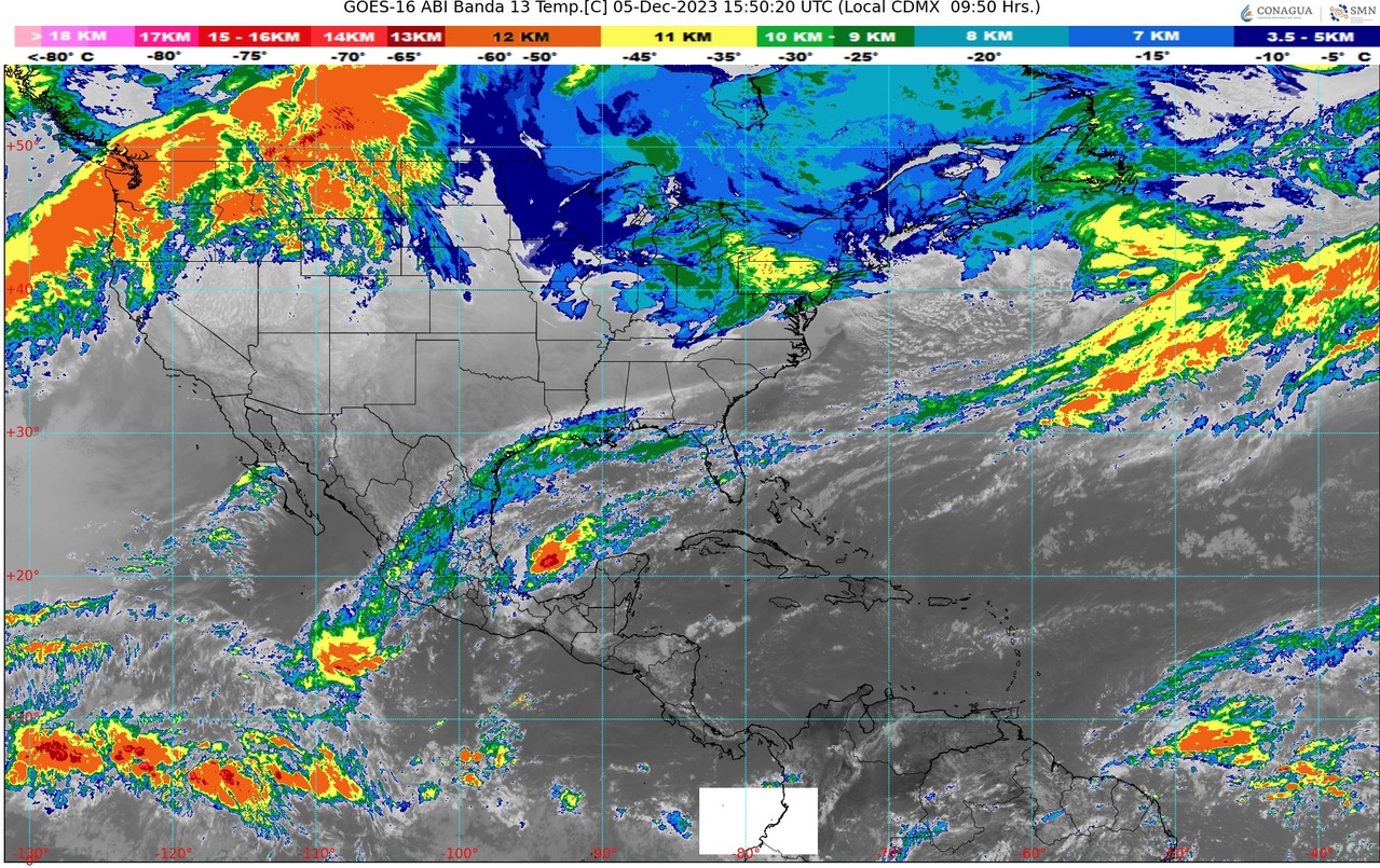 CDMX, 05 de diciembre del 2023.- Este día martes, el frente Núm. 13 se mantendrá con características de estacionario sobre la Península de Yucatán, e interaccionará con un canal de baja presión en el suroeste del Golfo de México y el sureste del país; aunado al ingreso de humedad generado por la corriente en chorro subtropical, producirán lluvias puntuales torrenciales en Veracruz (sur), Chiapas y Tabasco, además de lluvias muy fuertes a intensas en Oaxaca y la Península de Yucatán.