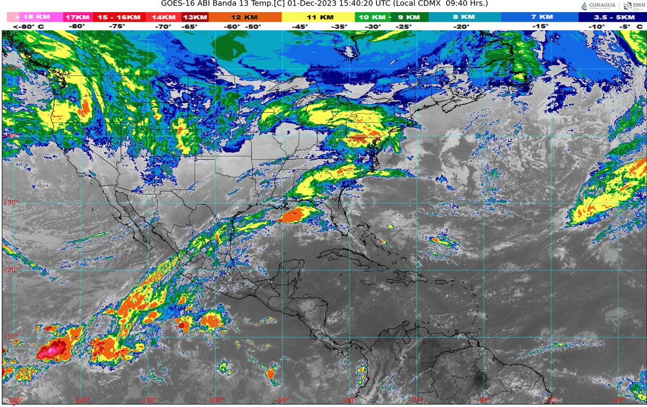 Finalmente, una circulación de alta presión sobre el Mar Caribe, mantendrá viento de componente sur (surada) con rachas de 40 a 60 km/h en Tamaulipas, Veracruz, Tabasco y la Península de Yucatán.Pronóstico de lluvias para hoy 01 de diciembre de 2023: