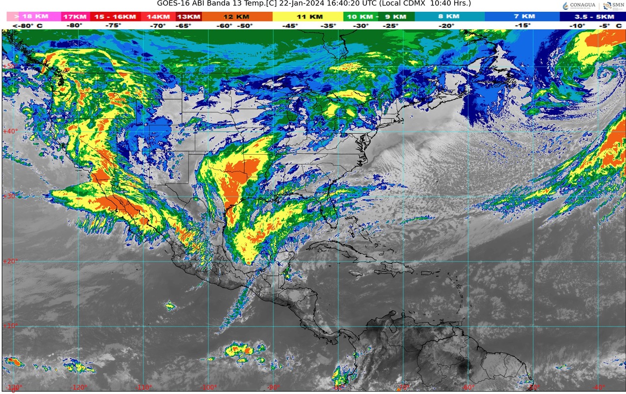 CDMX, 22 de enero del 2024.- Este día lunes, un frente frío (No. 29) de corta duración, se aproximará al noroeste del territorio nacional, interaccionará con inestabilidad en niveles altos de la atmósfera y con las corrientes en chorro polar y subtropical, ocasionando lluvias puntuales intensas en Baja California, lluvias puntuales muy fuertes en Sonora, lluvias puntuales fuertes en Chihuahua e intervalos de chubascos en Baja California Sur, Sinaloa y Durango.