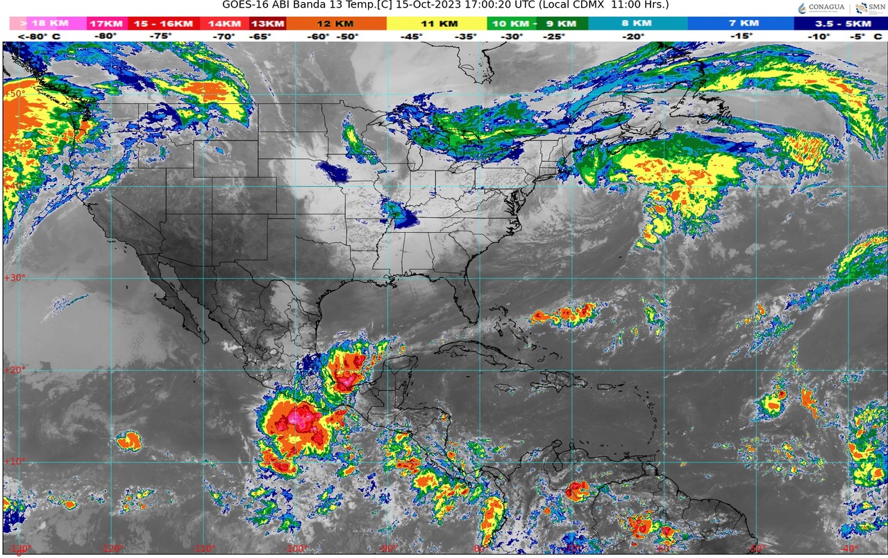 CDMX, 15 de octubre del 2023.- Hoy domingo, el frente frío Núm. 6 se desplazará sobre el sureste del país y gradualmente sobre la Península de Yucatán, originará lluvias puntuales torrenciales en Veracruz, Tabasco, Oaxaca, Chiapas y Campeche, lluvias puntuales intensas en Puebla, Guerrero y Yucatán, lluvias puntuales muy fuertes en Quintana Roo y lluvias puntuales fuertes en Estado de México e Hidalgo, así como chubascos en el norte, noreste y centro de México.