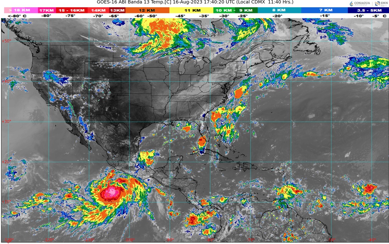 CDMX, 16 de agosto del 2023.- Para hoy miércoles, el posible ciclón tropical originado a partir de una zona de baja presión con potencial para desarrollo ciclónico localizada al sur de las costas de Guerrero y asociada con la onda tropical Núm. 22, mantendrán el potencial para lluvias puntuales intensas en Oaxaca, Guerrero y Michoacán y puntuales muy fuertes en Colima, Jalisco y Nayarit, las cuales se acompañarán de descargas eléctricas, además de rachas de viento y oleaje elevado frente a costas del sur y centro del Pacífico Mexicano, desde Oaxaca hasta Jalisco.