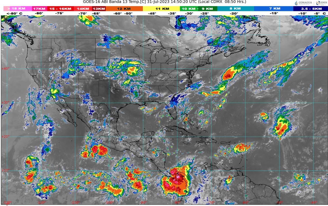 CDMX, 31 de julio del 2023.- Para hoy, la onda tropical Núm. 17 se desplazará sobre el occidente del país, mientras que la zona de baja presión con alta probabilidad para desarrollo ciclónico asociada, podría convertirse en un ciclón tropical al sur de las costas de Colima y Michoacán, lo que ocasionará lluvias puntuales intensas en Guerrero y lluvias puntuales muy fuertes en el occidente del territorio.