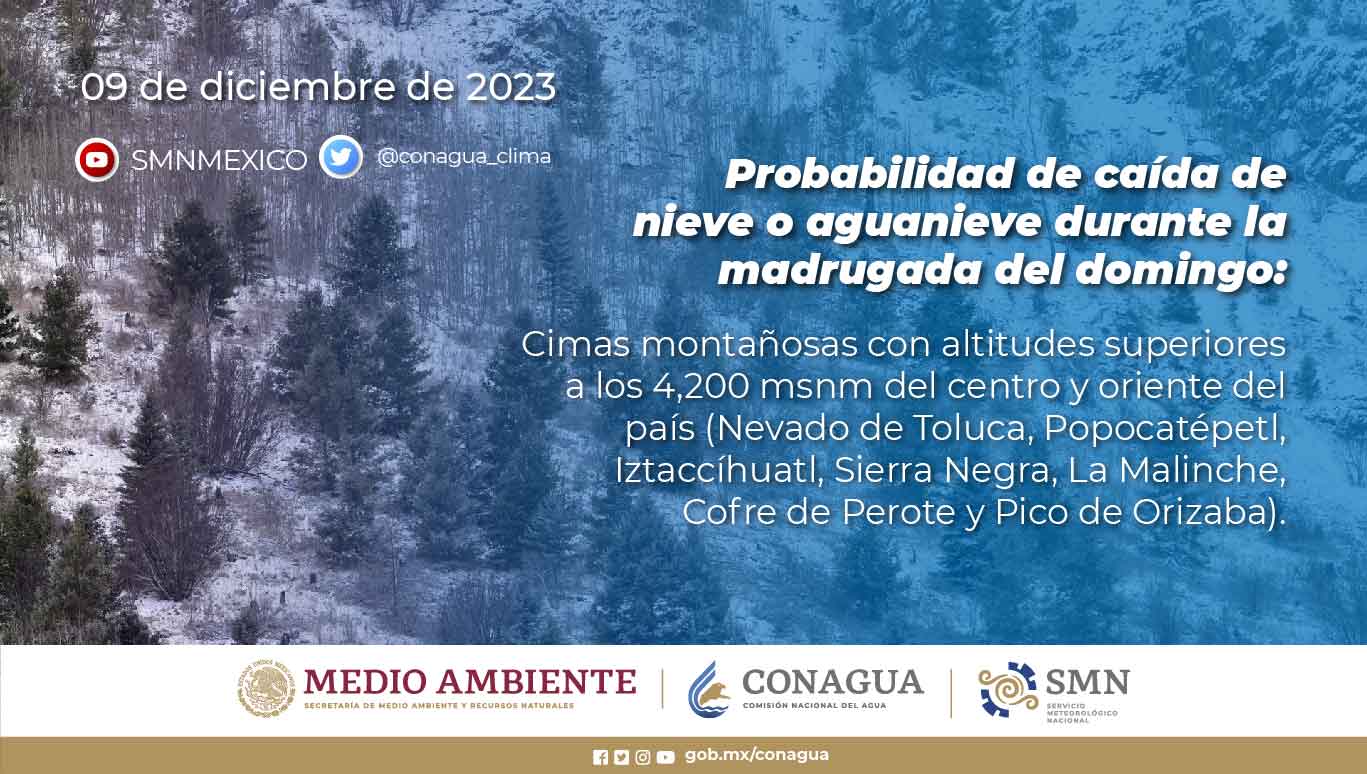 Probabilidad de caída de nieve o aguanieve durante la madrugada del domingo: cimas montañosas con altitudes superiores a los 4,200 msnm del centro y oriente del país (Nevado de Toluca, Popocatépetl, Iztaccíhuatl, Sierra Negra, La Malinche, Cofre de Perote y Pico de Orizaba).
