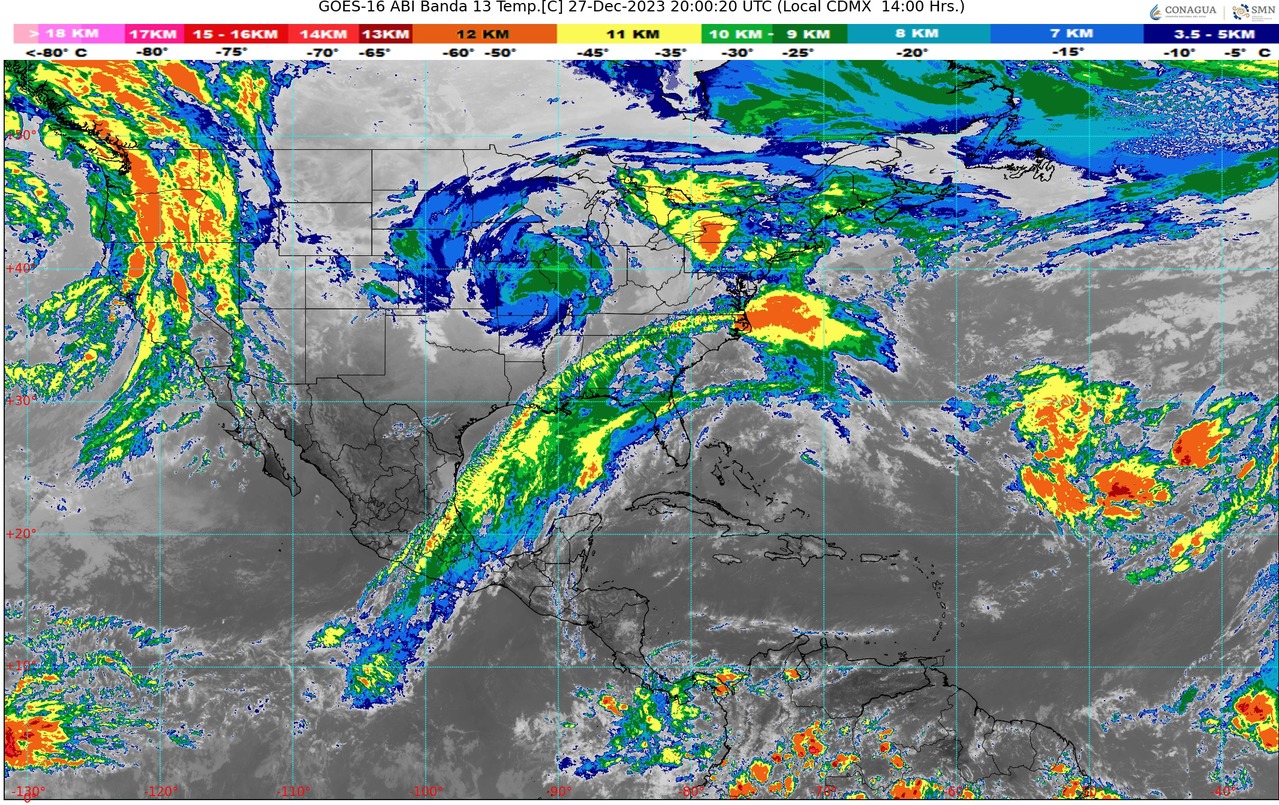 CDMX, 27 de diciembre del 2023.- Este día miércoles, la masa de aire frío asociada al frente No.19 será reforzada por una masa de aire polar, en interacción con la corriente en chorro subtropical, un canal de baja presión extendido en el interior del territorio nacional y una vaguada en niveles altos de la atmósfera, ocasionarán lluvias puntuales intensas en Puebla y Veracruz, lluvias muy fuertes en Oaxaca, Chiapas, Tabasco y la Península de Yucatán, así como chubascos y lluvias fuertes en el oriente y sureste del país.