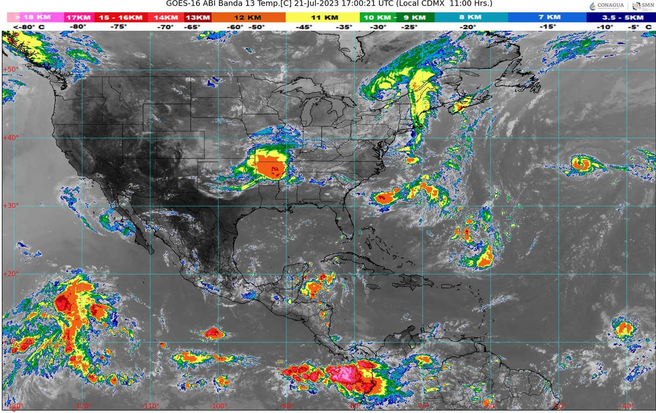 CDMX, 21 de julio del 2023.- Para hoy viernes, la onda tropical Núm. 15 recorrerá el centro y sur del territorio nacional, propiciará lluvias puntuales muy fuertes acompañadas de descargas eléctricas, rachas de viento y posibles granizadas en las regiones mencionadas, pronosticándose lluvias puntuales intensas en zonas de Michoacán, Guerrero y Oaxaca.