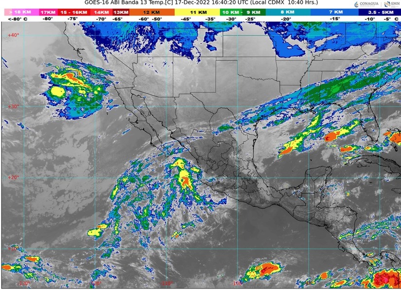 CDMX, 17 de diciembre del 2022.- Para hoy sábado, el nuevo frente frío Núm. 17 recorrerá el noreste y oriente del territorio nacional, ocasionará lluvias puntuales intensas en Puebla, Veracruz y Oaxaca, así como lluvias puntuales muy fuertes en Tamaulipas, Tabasco y Chiapas. Dichas lluvias podrían incrementar los niveles de ríos y arroyos, así como ocasionar deslaves e inundaciones en zonas bajas de los estados mencionados.